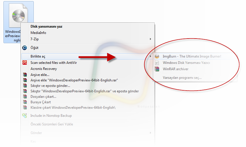 2.5.1- Windows 10 ISO dosyasına sağ tıklayın ve Birlikte Aç yolunu kullanarak 3.Parti aracınızı seçin.